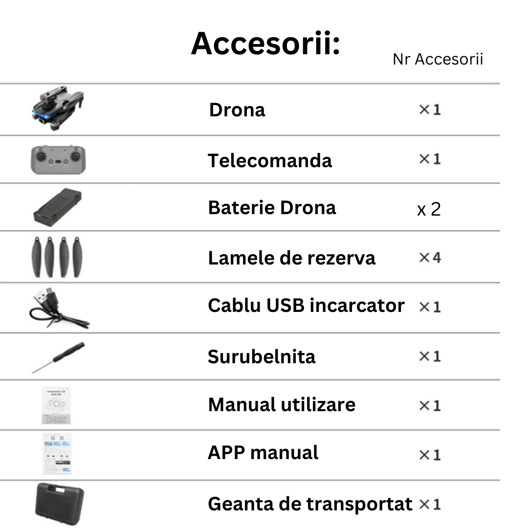 🔧 Accesorii: Quadcopter, telecomandă, baterii, cablu USB, șurubelniță, manual, palete rezervă.