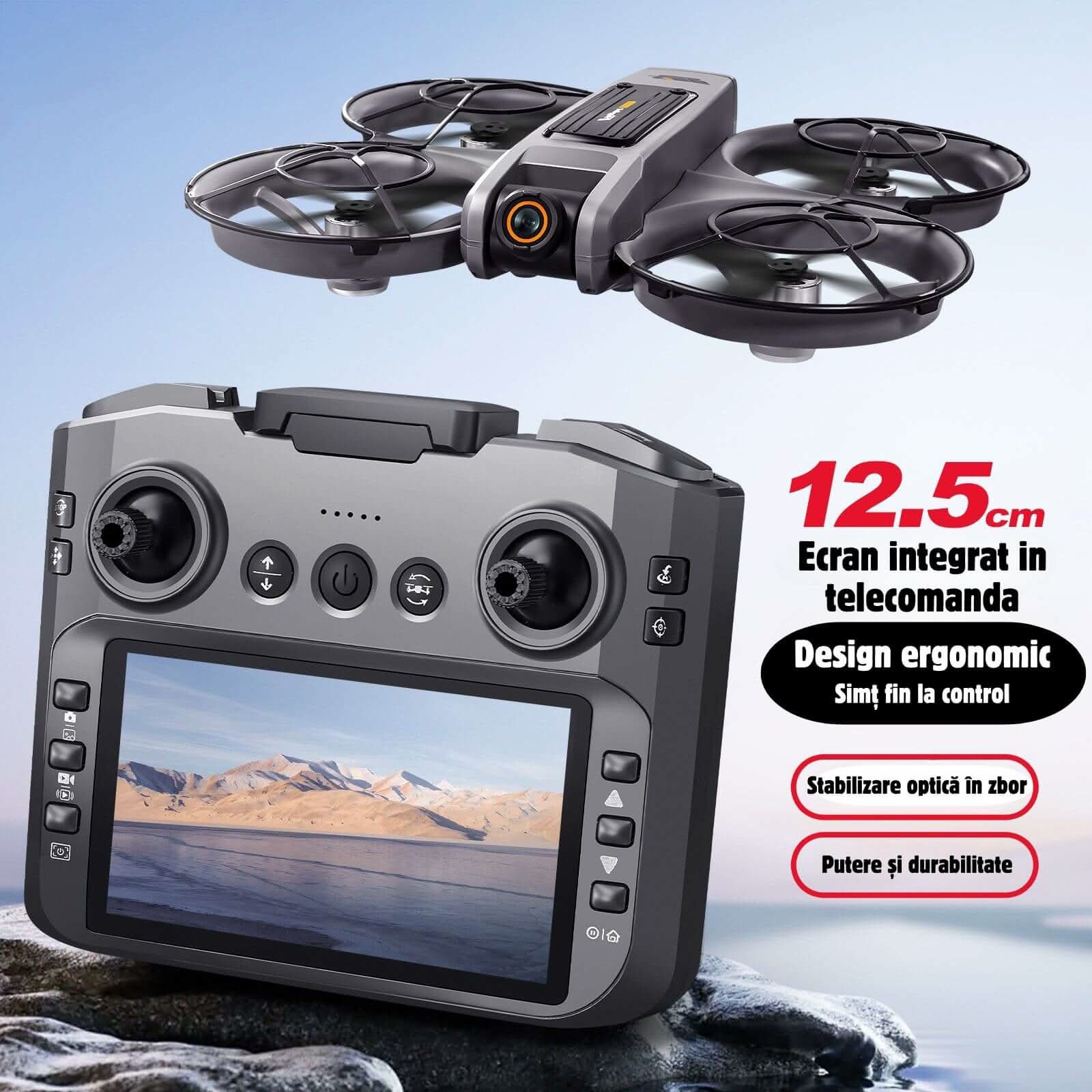 🔧 Accesorii: Quadcopter, telecomandă, baterii, cablu USB, șurubelniță, manual, palete rezervă.